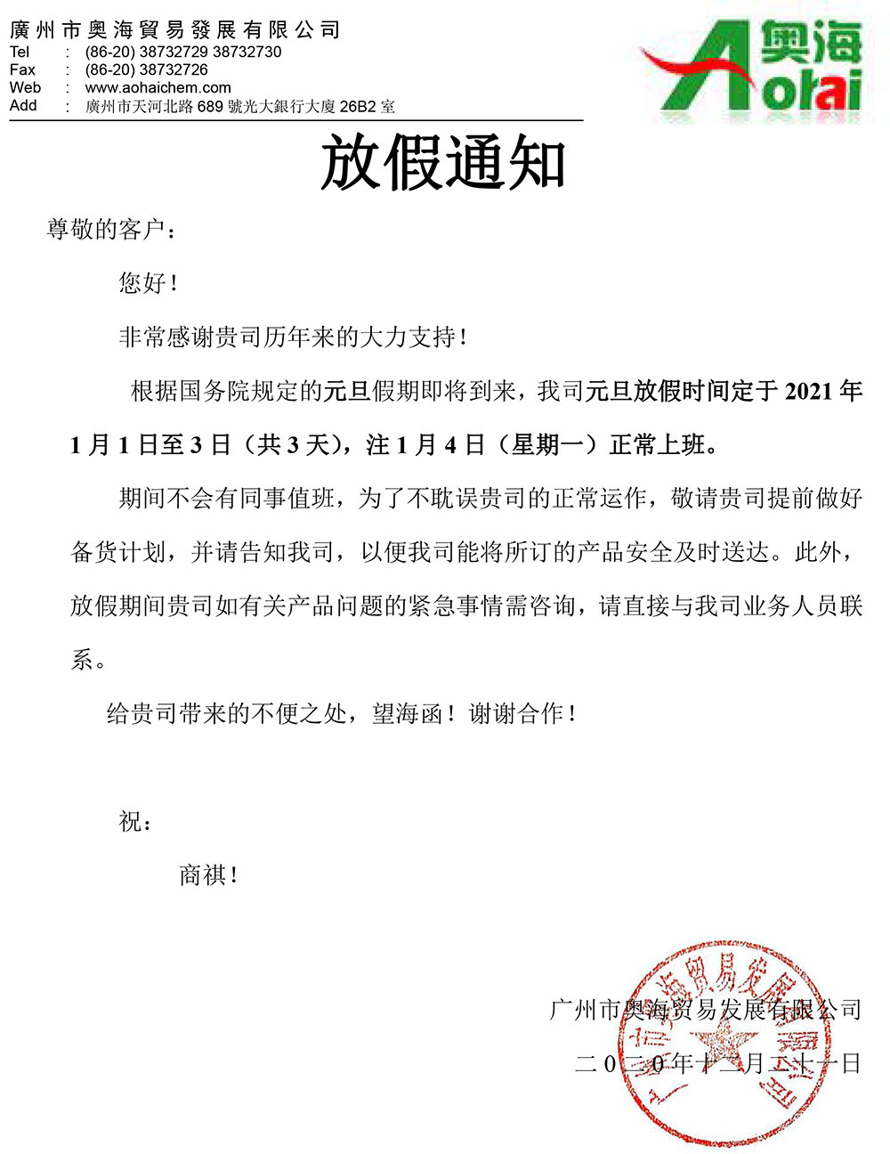 廣州奧海-2021假期通知(元旦)