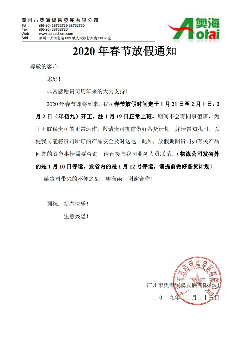 廣州奧海公司2020年春節放(fàng)假通知