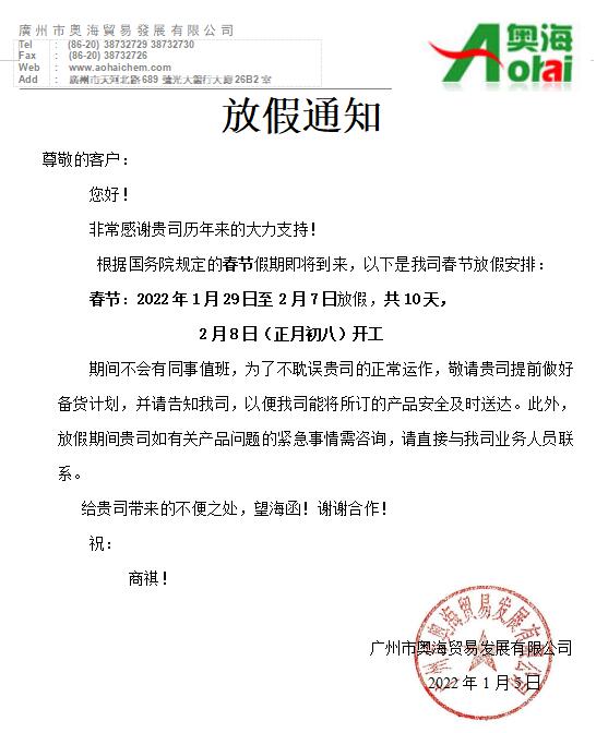 奧海公司2022年春節放(fàng)假通知
