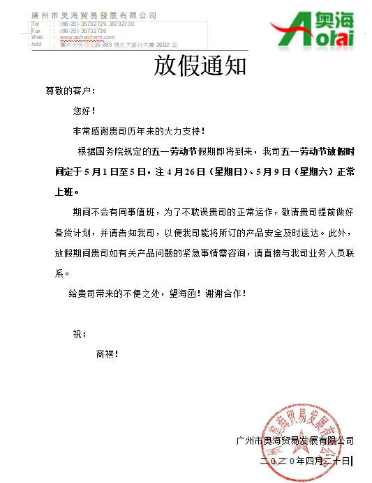 奧海公司2020年五一(yī)放(fàng)假通知
